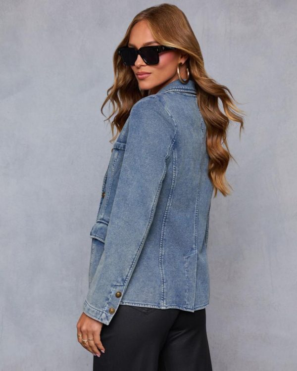 The Fall Right In Denim Blazer is your instant outfit elevator, sharp, sleek, and made to turn everyday plans into main character moments. Designed in stretch denim for a structured-meets-comfort fit, it features padded shoulders for a touch of polish and dual front button closures for that tailored edge. Front flap pockets and a faux breast slip pocket keep the look classic, while buttoned cuffs add a refined finish.