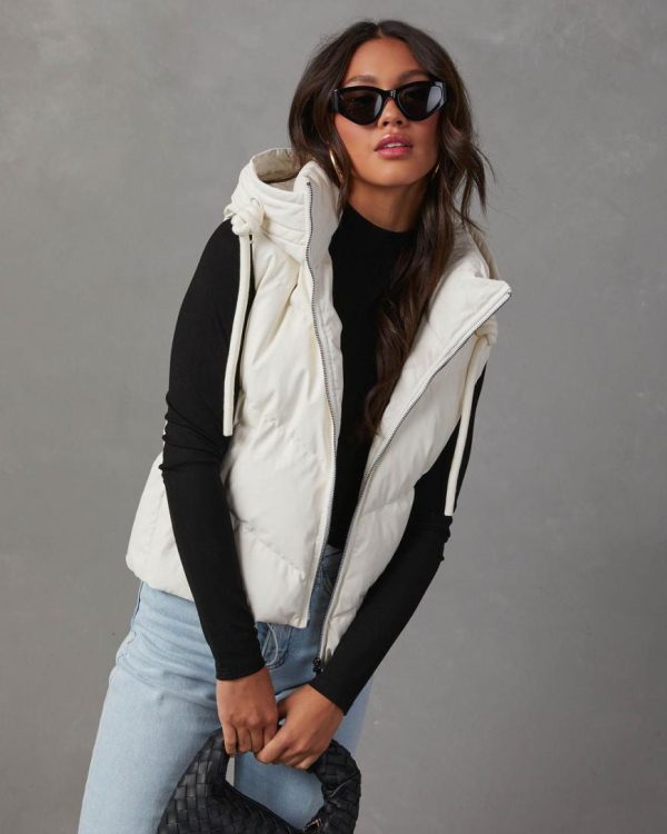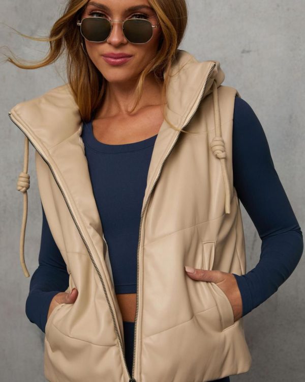 Add a layer of warmth in the Shelton Pocketed Hooded Faux Leather Puffer Vest in beige that features an adjustable waist tie.