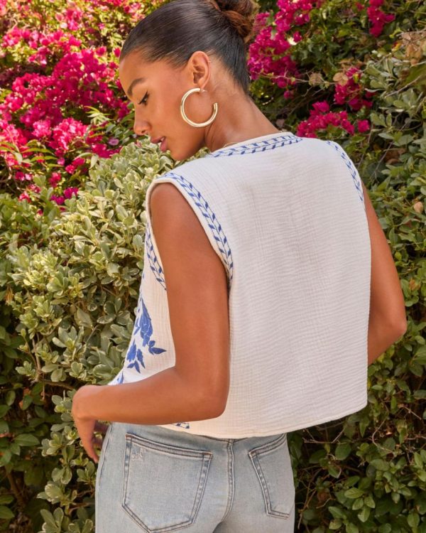Soft light, fresh air, and the Solenna Embroidered Vest Top. This dreamy little layer features breezy seersucker fabric adorned with delicate floral embroidery, bringing texture and charm to any outfit. The partial hook-and-eye front closures give a peek of vintage elegance, while the quilted lining adds a touch of structure for a flattering fit that moves with you. For the girl who knows every day deserves a little beauty, this vest is your new signature piece.